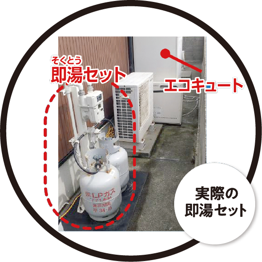 エコキュート・電気温水器・灯油ボイラーなどが故障した際に、LPガスだからこそ実現できる「仮設給湯サービス」です。ガス設備を活⽤し、⼀時的な給湯器を設置することで、その日からお湯が使えるようになります。設置後は約5日間お湯をご利⽤いただけるため、急なトラブルでも安心のサービスです。修理や機器の取替えについては、あとで落ち着いてゆっくりご検討いただけます。